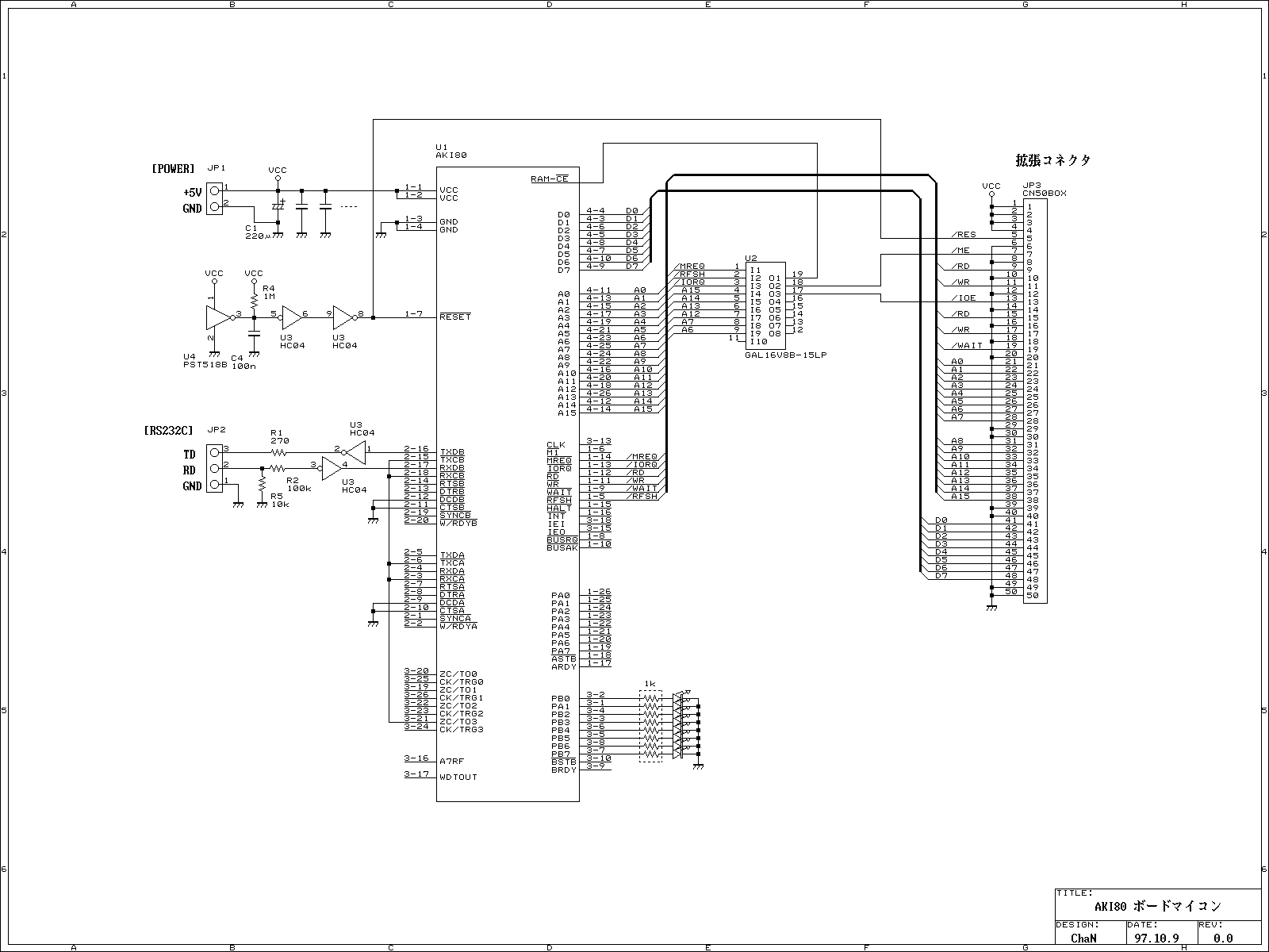 この製作ではアドレスデコーダにPLDを使用していますので、製作に当たってはPLDを利用できる製作環境が必要です(または、TTLで置き換え)。また、RS-232Cドライバに普通のC-MOSを使用していますが、通常の用途ではこれで十分です(その理由)。