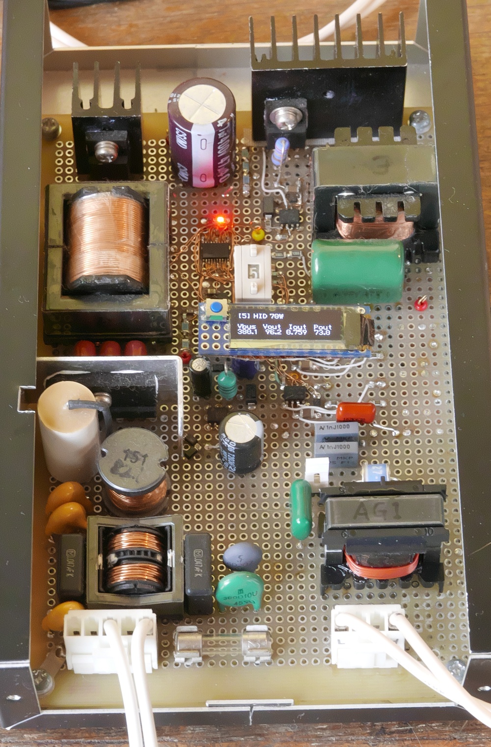 谷点スイッチングの効率は意外に良いようで、トランジスタには小さなヒートシンクを付けているだけですが、全負荷時もほんのり暖かくなる程度でした。その一方で最も発熱する部品が整流ブリッジとインダクタで、損失の多くを占めているようです。このため、先進的なPFC回路では整流ブリッジをトランジスタで置き換えた設計として効率を高めています。