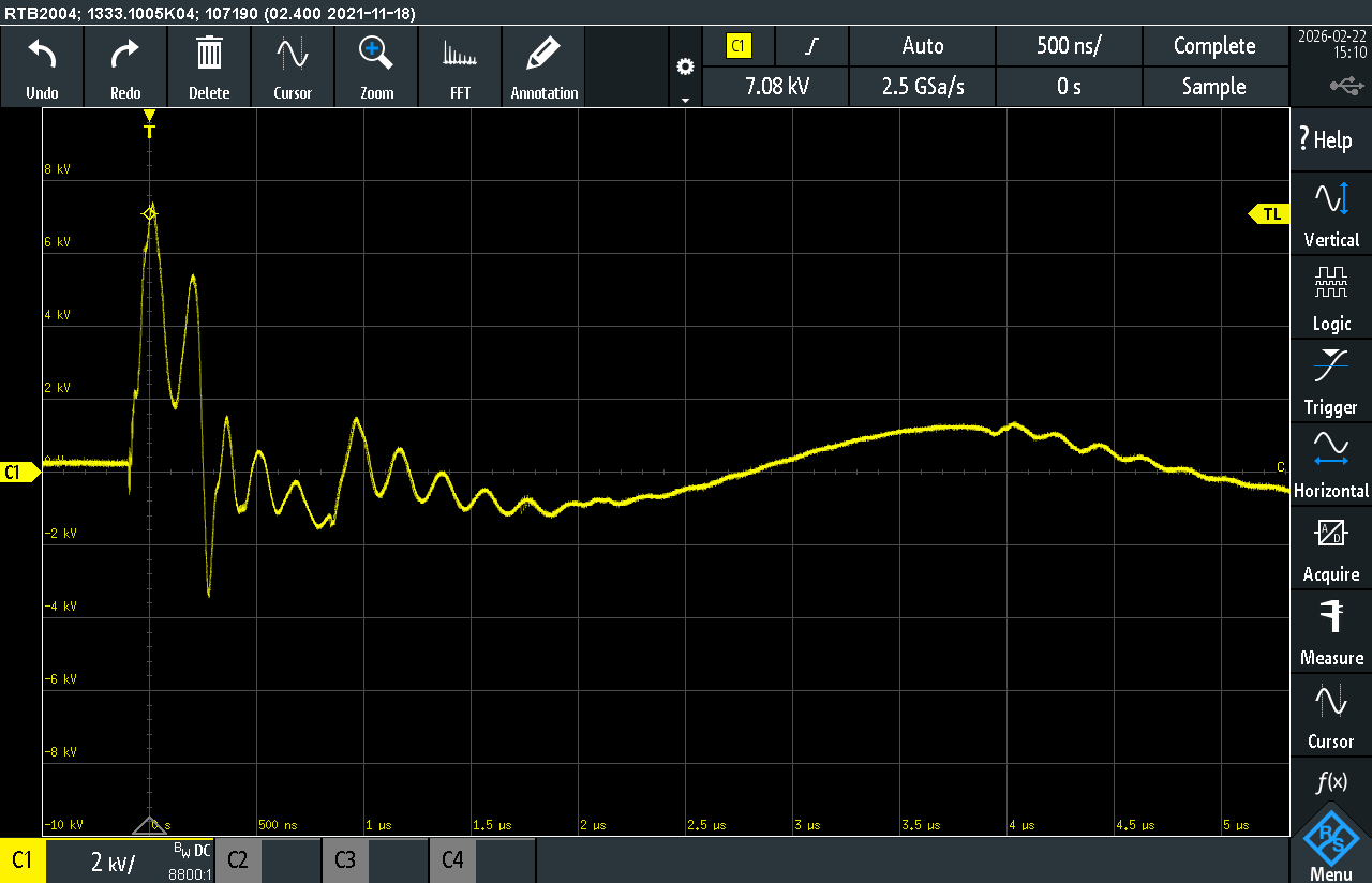 T1がイグニッショントランスで、コア:B66317GX187(g=0.2mm)、一次側:0.5mm ETFE線6T、二次側:0.5mm ETFE線50T(L=440μH, Isat=2.5A)という仕様です。図15に出力パルスの波形(配線未接続時)を示します。パルスのピーク電圧は6kV程度、非常に急峻(80kV/μs程度)な立ち上がりで、配線の引き回しには注意が必要です。これによるマイコンの誤動作には遭遇していませんが、テスト中は基板上で放電して迷走するなどして、Hブリッジのトランジスタやゲートドライバをよく壊しました。パルス電圧は配線の浮遊容量で減衰するので、電子安定器の仕様で最大配線長(1.5~2m程度が多い)が設定されています。