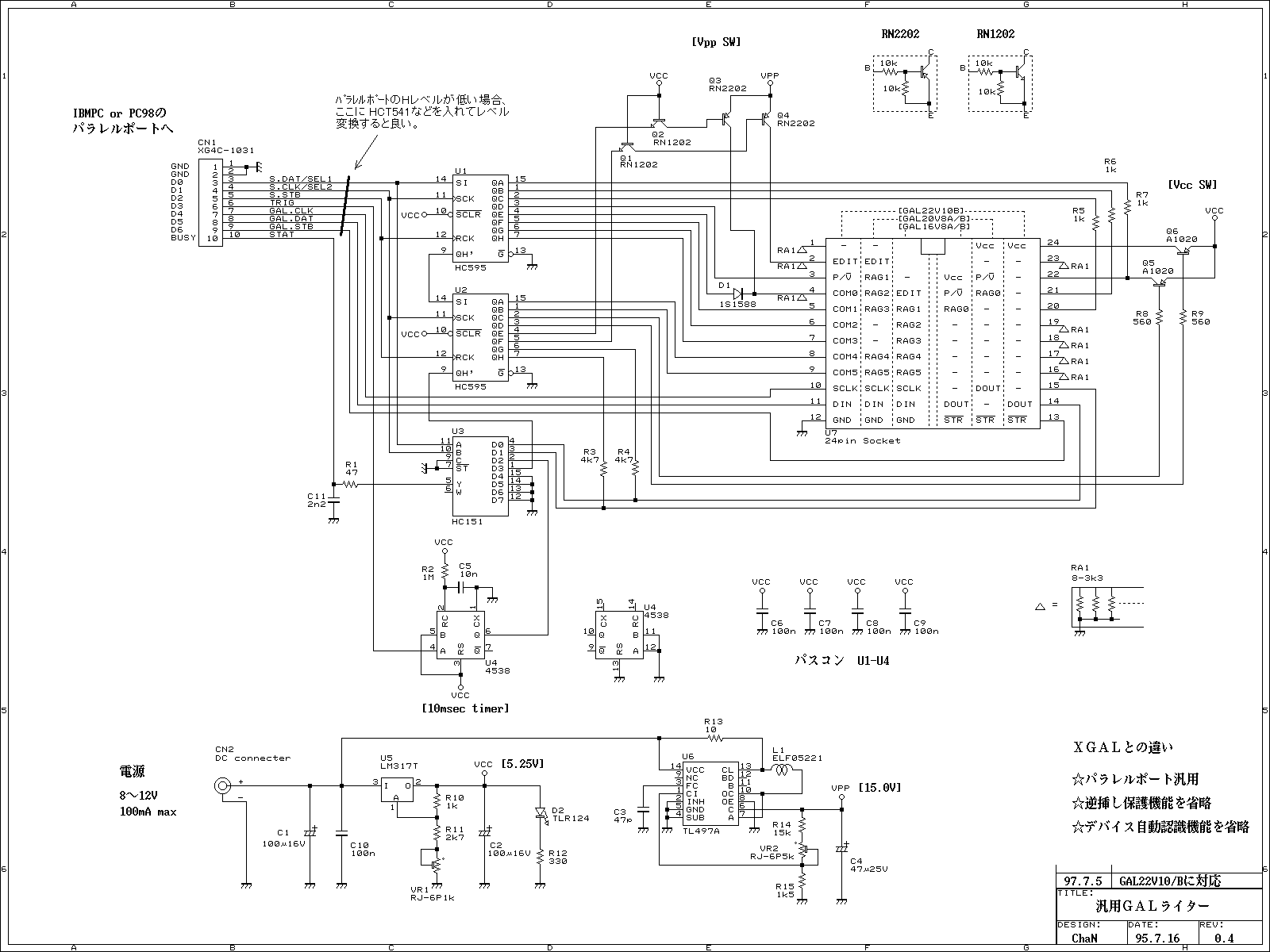 パソコンのパラレルポート(プリンタポート)で制御する方式なので、専用 I/Fは不要です。このため、ノートパソコンなどでも手軽に使用することができます。本体回路図をご覧になると分かると思いますが、使用しているのは出力7本と入力1本だけです。ダイナミックに操作する必要があるラインは、ポートの出力で直接操作、あまり頻繁に操作する必要のないラインはシフトレジスタ(U1,U2)で出力するようにしています。入力についてはマルチプレクサ(U3)で任意のものを選択するようにしています。また、プログラムパルスのタイミングを得るためのタイマー(U4)も載せて制御ソフトの簡略化・安定化を図っています。