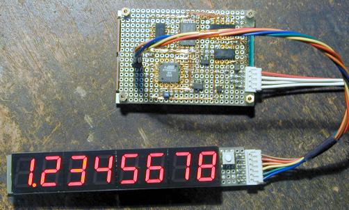 This is an eight digits numeric LED display which is controlled only three I/O lines. It has shift registers to hold display data, the display data is transferred in clocked serial transfering.