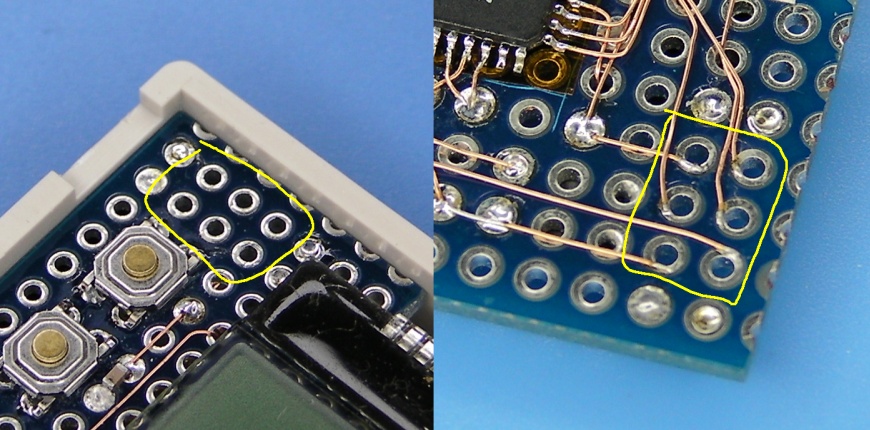 Conthrough is intended to be used for printed circuit boards. However it can also be applied for double-sided protoboards. I have started to use this method to the protoboards about ten years ago. You might have found that the ISP connector is not in the images of the microcontroller board in this site, such as this, it and that. Right image shows an example. The solderings to the via holes must be done with great care because the through-hole must not be filled with solder.
