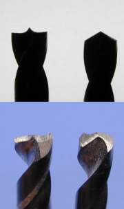 まぁ、何事も挑戦ということで興味があるならやってみるのも良いと思います。左の写真は製作した一文字ドリル(φ3.5mm)です。素人でも慣れれば結構まともな形にできるようですね(っても10年くらいやっているけど(^^;)。一文字ドリルはセンタリングのためチゼル(中心の稜線)が少し飛び出すように整形する必要があるため、回転砥石の角を使って研ぐことになります。このため、研ぎ始める前に砥石の角を整形しておかなければなりません(回転砥石を研ぐ砥石ってのが売っています)。作業は細いドリルほど難しいので、最初は数mm以上のドリルで始めると良いです。なお、ここで言うまでもありませんが、機械加工の基本を守って安全に作業しましょう。