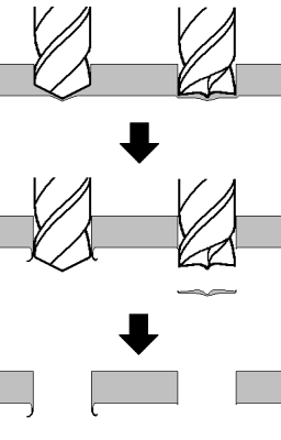 右の図に示すように、一般のドリルは貫通するとき中心から貫通するので、押し広げられた切りくずが穴の周囲にバリになって残ってしまいます。また、薄板に径の大きな穴を開けるときは、外周が決まる前に先端が貫通してセンターを失うので、真円度や位置精度も悪くなる傾向があります。これに対し、一文字ドリルは外周から先に貫通するので、真円度や位置精度も良好に仕上がります。バリがほとんど残らないのでバリ取りの必要もありません。このようにシャーシ加工に優れた特徴を持つドリルなので、よく使う径の一文字ドリルをいくつか揃えておくと良いでしょう。