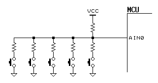 A-Dコンバータのあるマイコンなら、それを使って1ポートで複数のスイッチ入力を取れます。チープなポータブルCDプレーヤ等がよく使ってる方法です。この方法も 2個押しといった変則操作は不可です。
