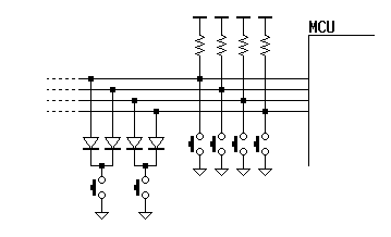 1入力ポートにつき1個の押しボタンスイッチというのが手軽な方法ですが、スイッチの数が増えてくると、たちまちポートが足りなくなってしまいます。このようなときは、ダイオードORを使ってスイッチ入力をコード化することにより入力点数を増やすことができます。たとえば、3ビットの入力ポートなら 7個まで、4ビットなら 15個まで拡張できます。ただし、スイッチの2個押しといった変則操作をするときは拡張可能数が減るので、ビットパターンをよく考える必要があります。