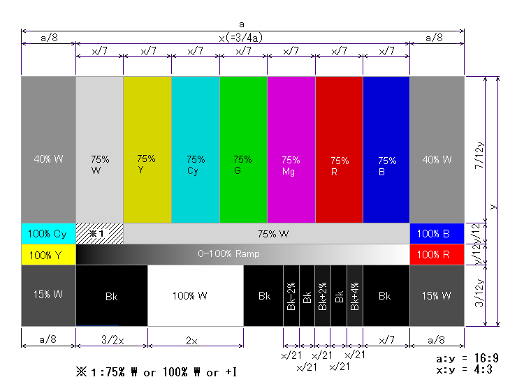 HDTVをはじめとするワイド画面(16:9)に対応したカラーバー信号。パン・スキャンで4:3に変換されるときは、左右の色帯が切り落とされる。75%白バー直下(100%シアンの右隣)の値は任意で、75%白、100%白、+Iの3通りがよく使われているらしい。