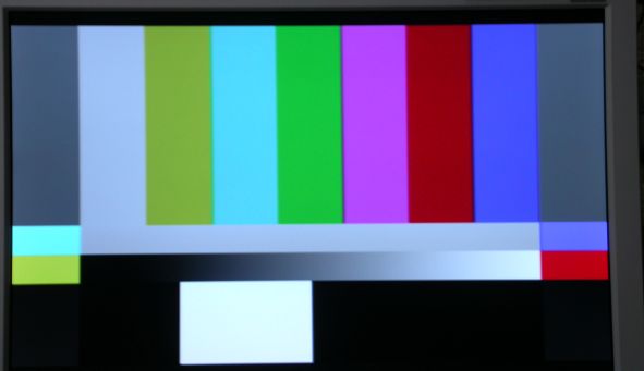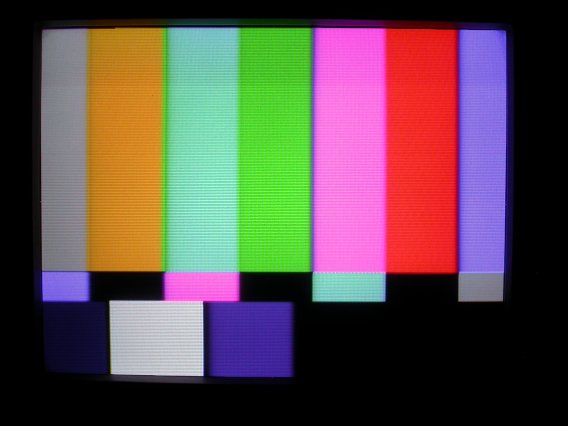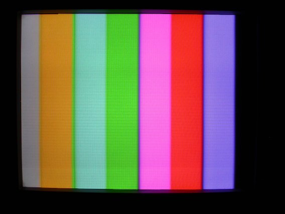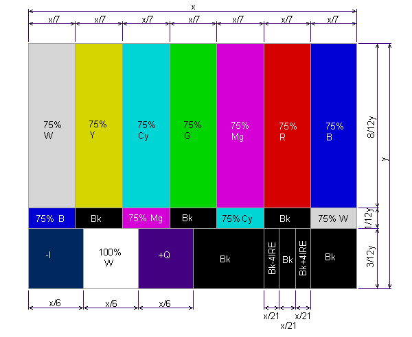 画面を水平方向に8分割した白・黄・シアン・緑・マゼンタ・赤・青・黒の各色帯で構成される最も基本的なカラーバー。白帯と他の色帯の輝度レベルの設定によって3種類のバリエーションがある。右の写真はそれぞれの色帯の輝度が75%なので、75%カラーバーと呼ばれ、黄とシアンに重畳される色信号のピークが100IREに達する。白帯のみ100%としたものが100%.75%カラーバーで、白レベルの調整に使用される。全て100%としたものは100%カラーバーだが、ピークが133IREとなり常に過変調になるので普通の放送テストには用いられない。