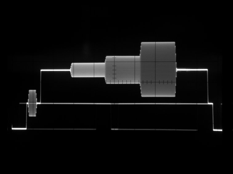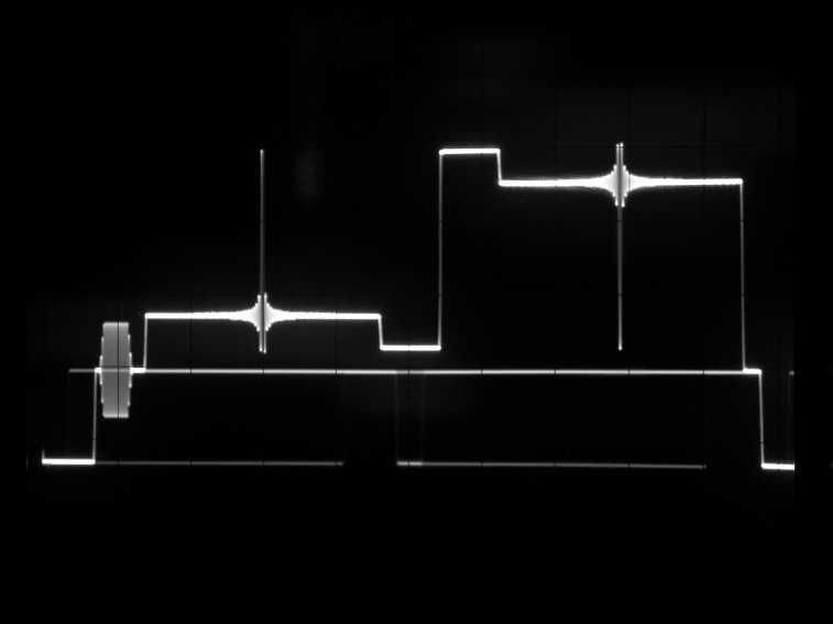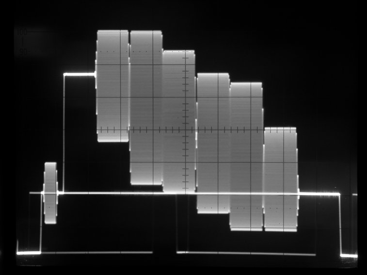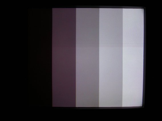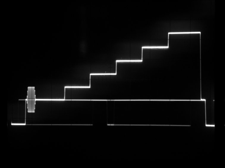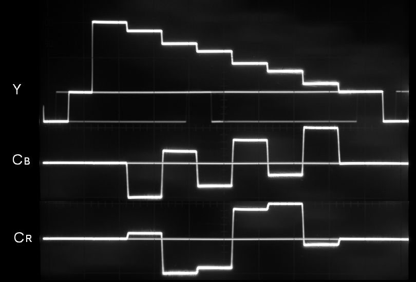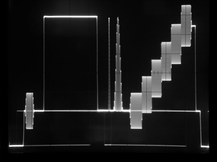 輝度リニアリティを調べるテスト信号。波形モニタを微分モードにして階段のエッジを示すパルスの高さが揃っていればよい。