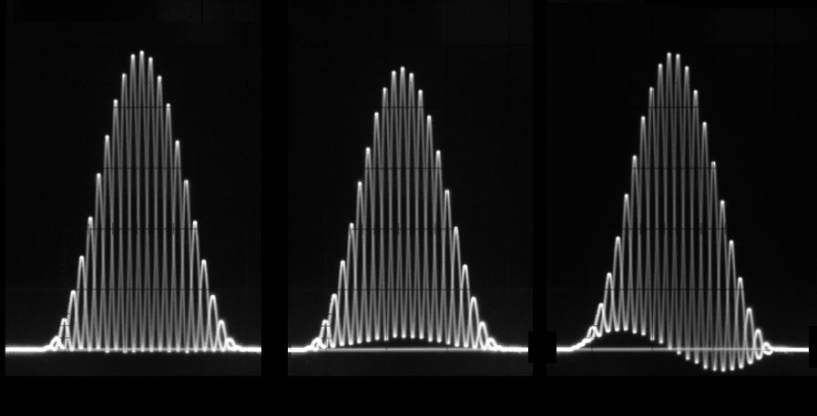 いくつかのテスト信号を1ラインにまとめて、複数の項目を同時に測定できるようにしたものがあり、NTC7コンポジットには、100%バー(サグ)、パルス(Kファクタ、高域ゲインやクロマ遅延)、変調ステアケース(DG/DP)が含まれる。右の画像は12.5T変調パルスの拡大で、左から正常、クロマ減衰、クロマ遅延の状態を示す。2Tパルスは高域ゲインが正常なとき、ピークが100IREになる。