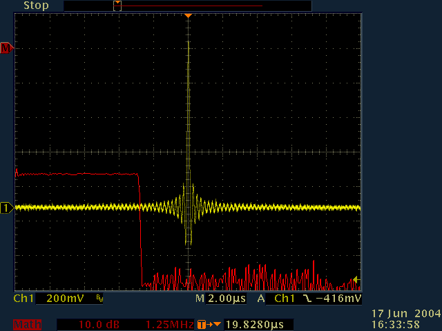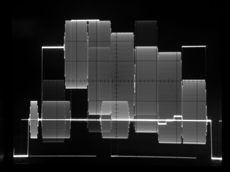 クロマ信号が輝度に与える影響を調べるためのテスト信号。正常なときの波形は上下対称になるが、クロマ信号がDCオフセットに影響を及ぼしているときはエンベロープが上下どちらかに偏る。