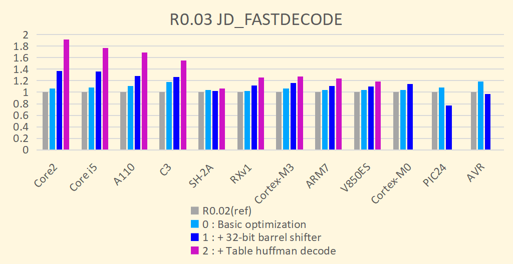 This option switches the decompression algorithm. How this option affects the performance is highly depends on the processor architectre as shown in right image. The Lv.0 is the basic optimization in minimal memory usage suitable for 8/16-bit processors. The Lv.1 depends on 32-bit barrel shifter and is suitable for 32-bit processors. It requires additional 320 bytes of work area. The Lv.2 enables the table conversion for huffman decoding. It requires additional 6 << HUFF_BITS, 6144 by default, bytes of work area.This is a copy of the TJpgDec license document that included in the source codes.