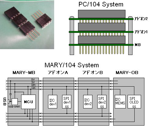 PC/104では他の汎用バスにあるようなバックプレーンボードを持たず、右の図に示すような足長のソケットヘッダを使って複数の基板をバス接続しています。各基板はスタッドで連結され機械的に堅牢な構造のため、産業用コンピュータ基板として一定のシェアを占めています。MARY/104ではMARYシステムの仕様に合わせてソケットを半田面に実装(PC/104とは逆)します。この方が置いたとき据わりが良いですしね。当然ですが、部品面を全て使うモジュール(OBやLB)はスタックの最上段に来なければなりません。回路的には図に示すように2つのシリアルバス(SPIとI2C)がメインになります。