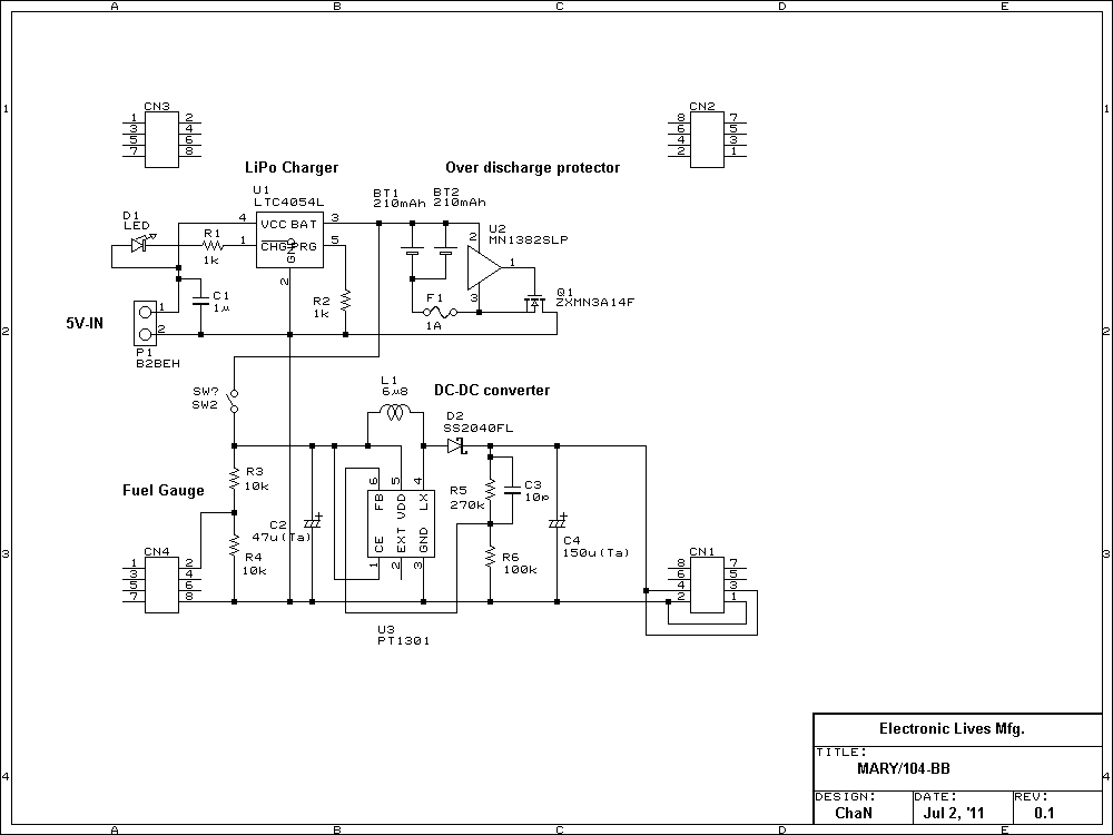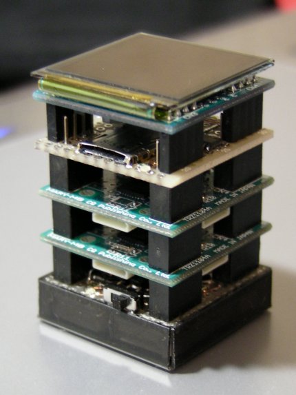 コンパクトなLiPo電池内蔵のスタッキング基板を作ってみました。これは単なる電源ユニットなので、MBに足長ソケットを実装してあれば、既存のシステムと互換性を保ったまま3段スタッキングが可能です。供給可能な電流は最大300mA程度になります。なお、電池電圧をモニタして残量表示できるようにするため、どの基板にも割り当てられていないPIO1.10(AD6)を使用しています。