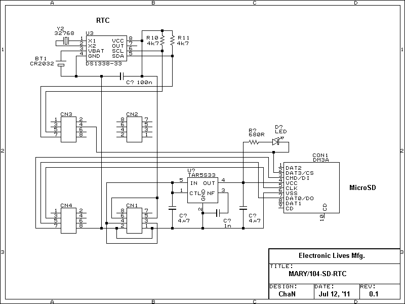 microSDカードとRTCを搭載したスタッキング用基板です。microSDのCS信号はアレイ通信ポートから取っているので、XB基板との同時使用で2ドライブシステムとすることもできますが、その代わりにアレイ接続はできなくなります。RTC(DS1338)はGB基板搭載のものとは異なるので、GB基板のRTCとの同時使用でも衝突することはありません。DS1338にはRTCのほか、56バイトの不揮発RAMもあるので、EEPROMを持たない32ビットマイコンでは重宝すると思います。