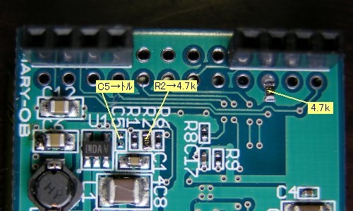 必要なことは電源投入時および電圧低下の際、確実に昇圧回路をOFFにし、かつOLEDドライバはリセット状態に保つことです。LPC111xのGPIOポートはリセット時プルアップ(つまりHレベル出力)なので、現状では両方ともダメです。このため、これに打ち勝ってLレベルを保てる程度のプルダウンを昇圧回路とリセット信号に追加します。さらに、システム初期化の際は次のコードに示すようにマイコンのBOD機能を有効にします。これで電源OFF時の不正動作を防ぐことができます。