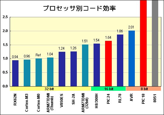 LPC111xはどの辺りかというと、比較的大規模な8ビットマイコンに相当します。ROM容量は8〜32Kバイトと少し少ないように思えますが、32ビットアーキテクチャのコード効率は右の図に示すようにとても高く、8ビットでトップクラスを誇るAVRのさらに2倍(処理内容にもよる)にもなります。つまり、32KバイトのLPC1114は、64KバイトのAVRに相当するボリュームのプログラムを扱えるのです。