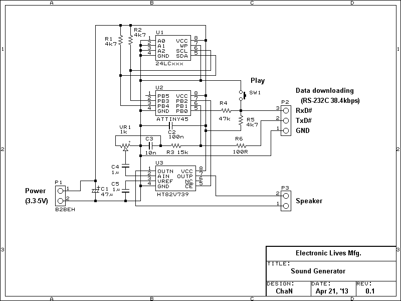 RS-232Cラインを外して電源を入れる(PB0がHレベル)と再生モードで起動し、ボタンが押されるのを待ちます。待機中の消費電流は1μA以下になります。ボタンが押されると音声を1回再生しますが、押され続けている間はリピート再生します。