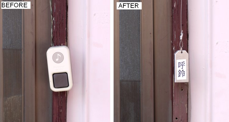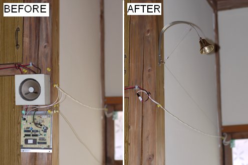 更新が目的になってしまったので、楽しくやれれば何でもイイだろうと思いついたのが、電気を使わない呼び鈴。「そんなの電子工作じゃない」と言われそうですけど、ある目的を達成するためなら必ずしも電子回路を使う必要はありません。特にメカトロ系ではこういうことがよくあり、設計センスの良し悪しがはっきり現れるものです。そうして新たに完成した呼び鈴は、ひもを引っ張ってベルを鳴らすという超原始的なものとなりました。単純でもこういった「ひもを引くと仕掛けが作動する」類の工作というのは、なんかこう、子供の頃の工作教室のようなワクワク感がありますね。そして、終わってみれば「呼び鈴は押しボタンという常識」をこれまた覆すものができあがりました。よしっ、これからの来訪者は新たな驚きと感動を覚えるに違いない...(くすっ☆)