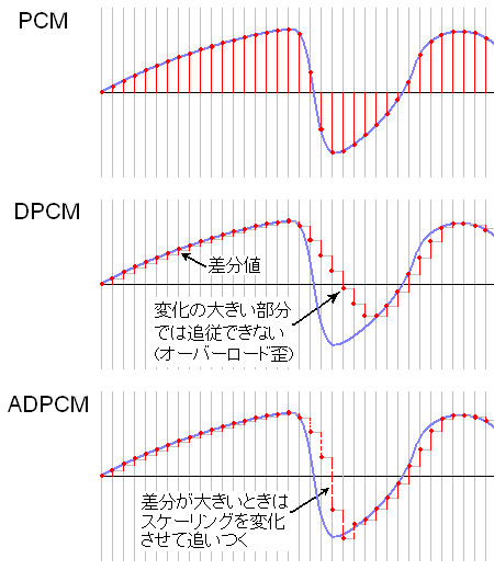 PCMでは全てのサンプル・データがそのサンプリング・ポイントの値を直接示しています。これを一つ手前との差分値とすることにすれば、より少ない範囲の(ビット数の少ない)サンプル・データで波形を表すことができ、データ量を圧縮できます(差分PCM: Differential PCM)。