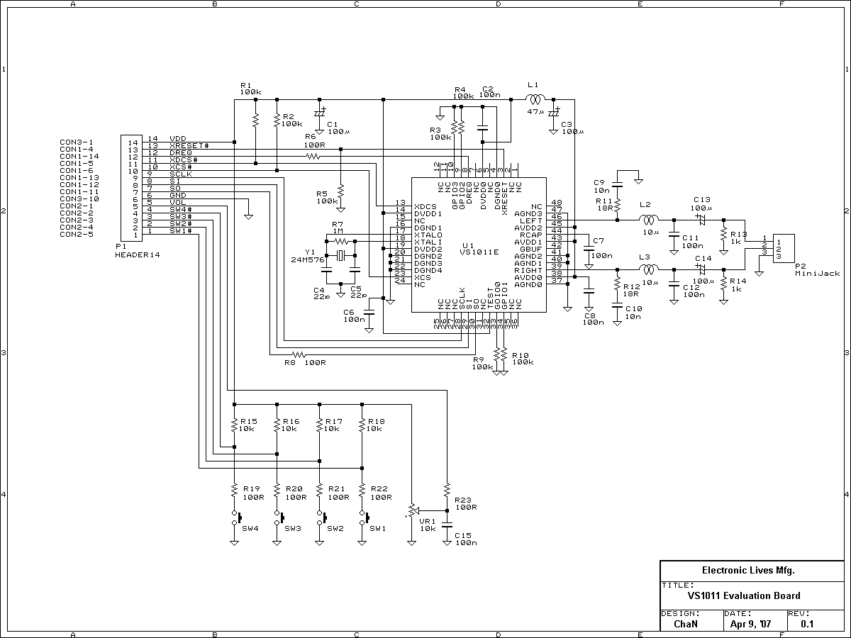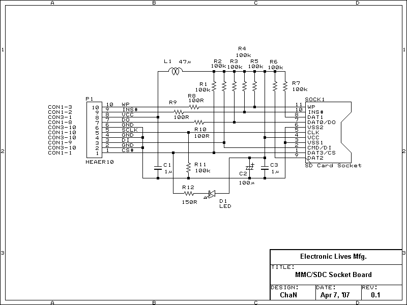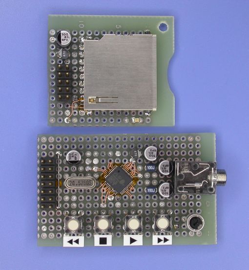 MP3プレーヤを作るには、メモリ・カード・ソケットとMP3デコーダ・チップを基板に接続する必要があります。これらのアタッチメントは、ほかに使い回せるように個別の基板に組みました。メモリ・カードには手軽に制御できてホビー用として最もよく用いられているSDメモリ・カードを使用します。MP3デコーダには秋月でも売っているVS1011を使用します。VS1011は入手性と使い勝手は良いのですが、内蔵DACがタコなのが欠点です。0dB設定基準の実測SNRは50~60dBそこそこ、さらにアッテネータがDAC前段なので、ヘッドホンで音量を絞って聴くにはかなり辛いレベルです。回路図中のコネクタのところに記入されている記号は、このプロジェクトでの接続先(マイコン基板の端子番号)です。