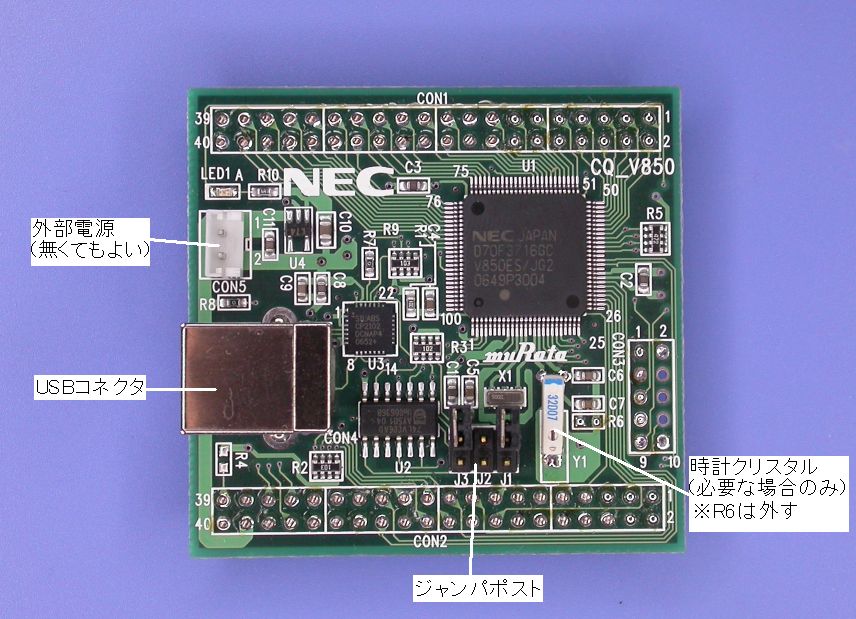 USBコネクタは、秋月のが合います。基板をユニバーサル基板に載せたい場合は、ほかにソケット・ヘッダかピン・ヘッダを用意すればいいはずですが、CON1~3が1/10″グリッドにアライメントされていないので、それは叶いません。CON3はハーフ・ピッチ程ずれているので絶対無理ですし、CON1とCON2もおよそ326μmずれているので、やはり何らかの工夫が必要です。このほか、サブ・クロックを使用した実験をする場合(このレポートでは使用しない)は、Y1に時計クリスタルを付けます。この場合、発振止め?のR6を外さないと発振しないので注意が必要です。