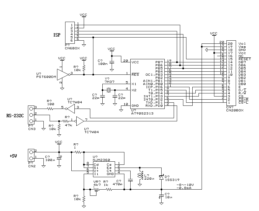 これだけあれば使うには十分だと思いますが、実験に使った回路等もとりあえず置いておきます。このほかにバックライトのCCFLを点灯するインバータも必要です。点灯しなくても十分見えますが。CCFL管を引っこ抜いて白色チップLEDを並べた基板を入れれば扱いが楽になると思います。