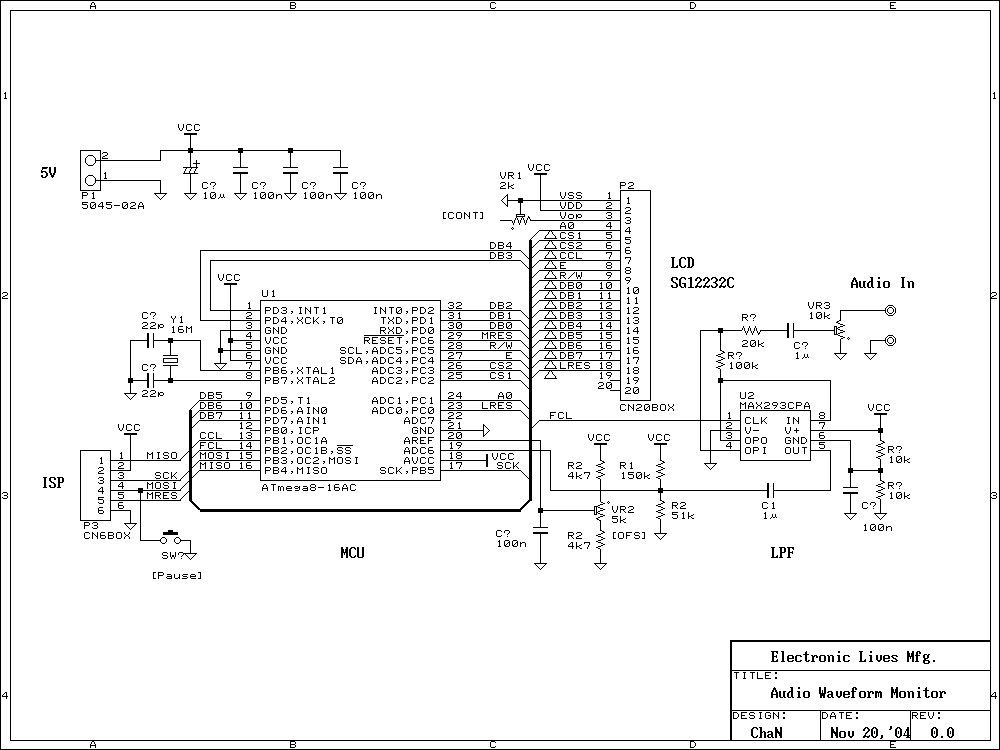 右に制御基板の写真と回路図を示します。お馴染みのmega8でオーディオ信号をA-D変換してLCDに表示しているだけなので、とても簡単ですね。A-D変換のプリフィルタには、MAX293(8次エリプティックLPF)を使ってみました。SCFを一度使うとオペアンプで組むのがアホらしく感じます。