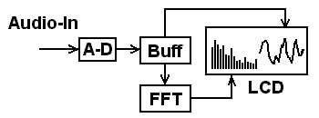右の図に内部処理のフロー図を示します。A-D変換された信号はFFTアルゴリズムでフーリエ変換されてLCDの左半分(64dot分)にヒストグラム表示されます。また、波形表示はゼロクロスまでシフトしてなるべく静止して表示されるようにします(右半分残り58dot)。