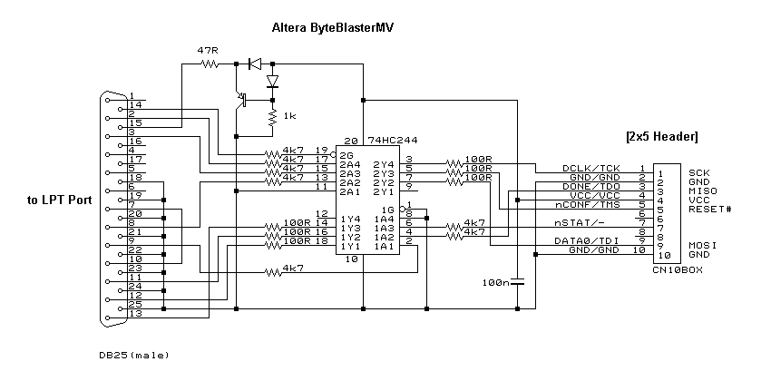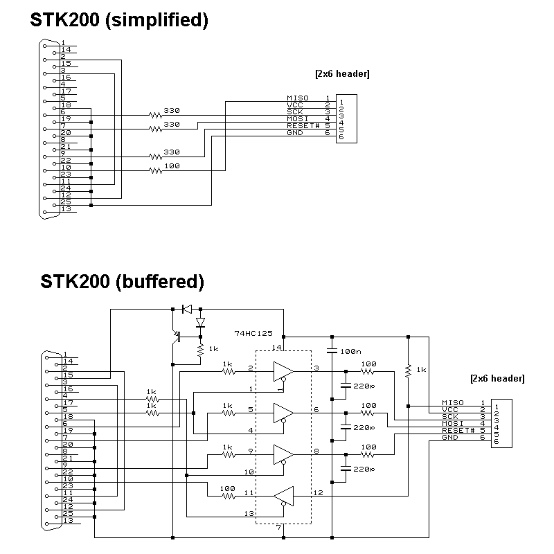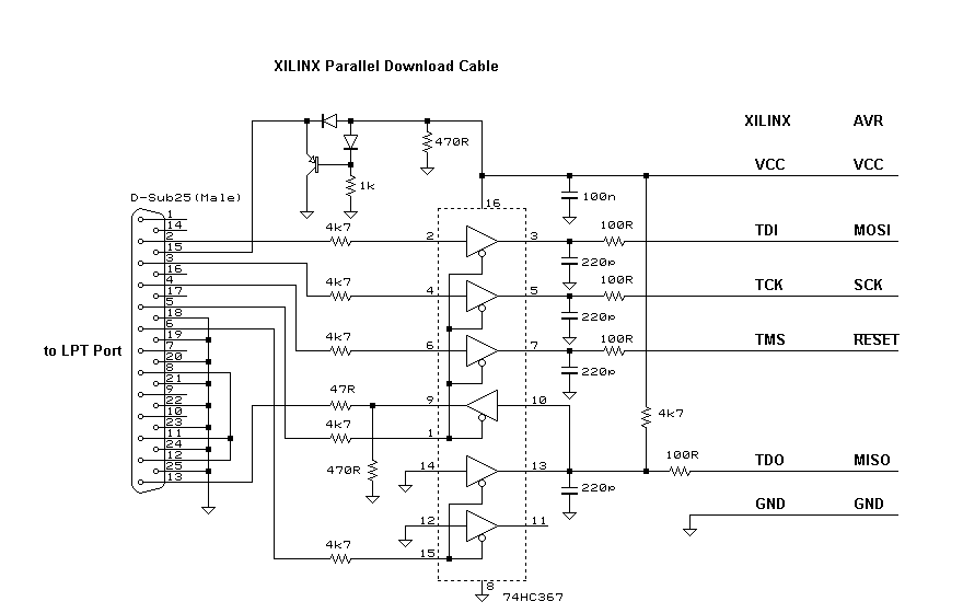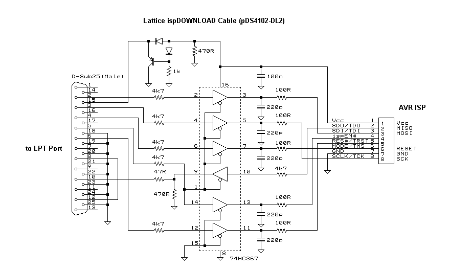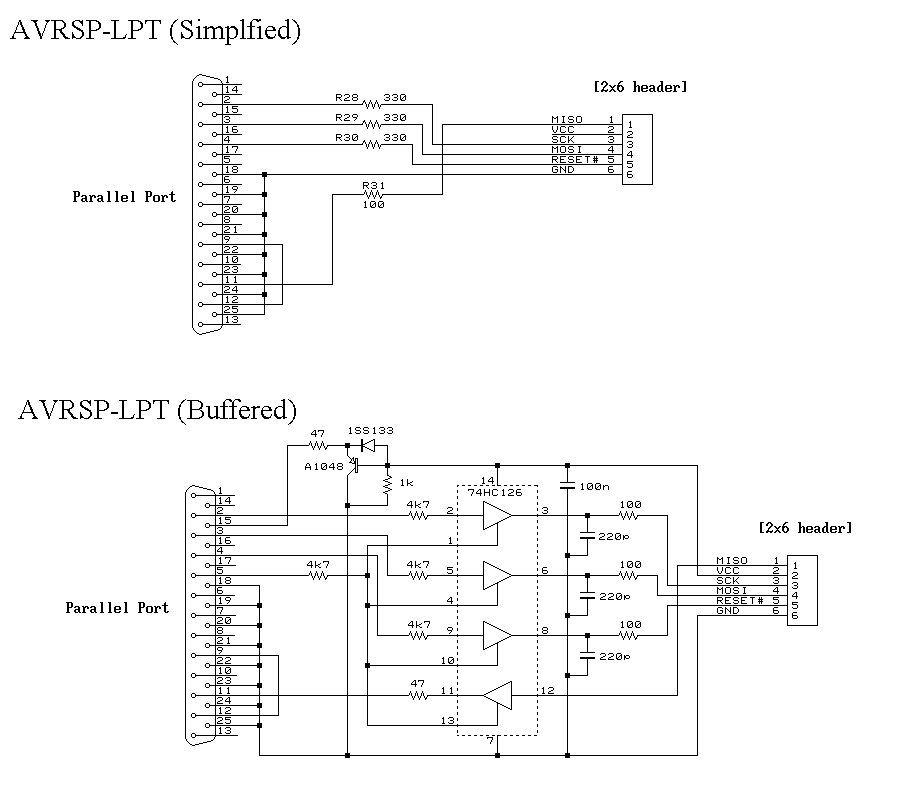 これは、コストダウンと再現性(誰でもすぐ作れる)を狙った物です。回路図に示す簡易版は能動部品は使用せず、単純に LPTポートの入出力をISPコネクタに直結するようになっています。このように非常に単純なため、10分もあれば組み立てられると思います。部品もジャンク箱を漁れば出てくるようなものだけです。AVRを試してみる準備としては、これが一番安上がりでしょう。しかし、簡易版アダプタは信号レベル変換をしていない(ターゲットに合わせていない)ため、ターゲットの電源電圧は約4.5~5.5Vの範囲という制限が付いたり、一部のPCでは動作が不安定になったりしてしまいます。