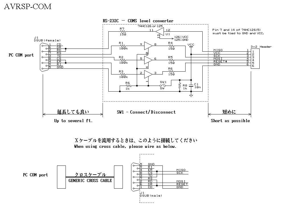 これは、COMポートで制御するタイプの ISPアダプタです。RS-232Cの信号電圧レベルをターゲットシステムに合わせるためゲートICを使ってレベル変換していますので、2.2~5.5Vのターゲット電源で使用可能です。また、この ISPアダプタはホストPCとターゲットの通信ケーブルとしても使えます(後述)。普通のAVRシステムの開発にはこれだけあればとりあえず十分でしょう。