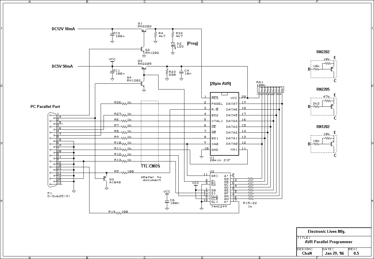 ここで紹介するライタは多くの市販ライタと違い、ライタ側にコントローラを設けずにPCのポートで直接制御をしているのが特徴です。それにより、ライタとの通信などの余計なオーバーヘッドが無くなり、プログラミング時間の大幅な短縮を実現しています。しかし、このように独自仕様なので、AVR Studioからは直接使えません。いや、とりあえず使えることは使えますが...。また、WinAVRではmakeで使うこともできます。