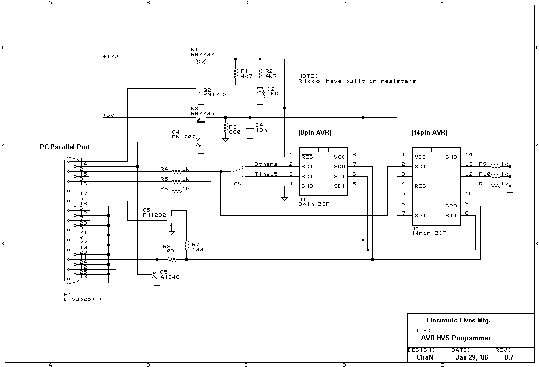このようにパラレルライタがどうしても必要になる場面は限られてくるので、普通はISP方式だけで十分です。でも、8ピンAVRに関してはHVSモードで書き込めないと何かと不便なので、8ピン専用HVSライタも用意してみました。