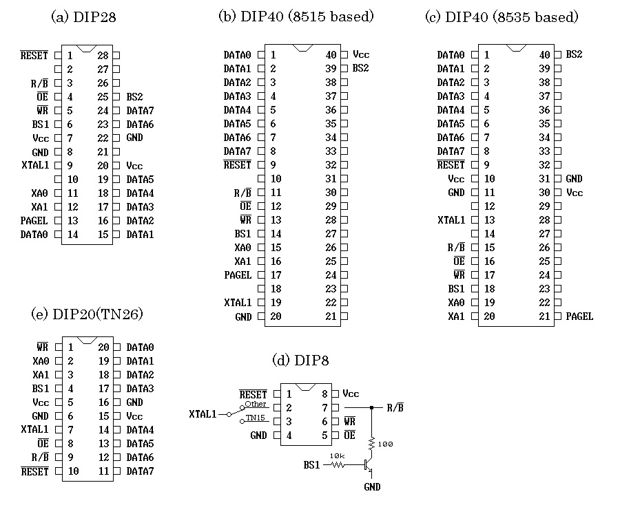 もう一つは、シリアル信号でやり取りするモードで、シリアルダウンロードモード(以下ISPモード)といいます。このモードでは 3本のロジックレベルの信号だけでコマンドやデータをやりとりして書き込みます。必要な信号線数が少なく、+12Vのプログラミング電圧も必要無いので、単純なインターフェースで回路に組み込んだ状態でプログラムできます。これはいわゆるISP(In-System Programming) と言われている方法です。ただ、ISPモードの無いデバイスがあったり、ISPモードでは一部の機能を変更できないデバイスがあるので、そのような場合はパラレルモードを使わなければなりません。しかし、市販のソケット式AVRライタはどういうわけかISPモードを使用しているものが殆どで、これらの問題が避けられないので注意が必要です。