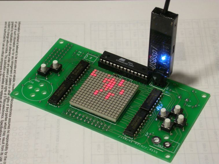 これは、アトメルの推奨する ISPコネクタのピン配置で、6ピン(3×2)、2.54mmピッチのピンヘッダを使用することになっています。ISPケーブルの製作や、ターゲットボード側の ISPコネクタはこれを基準にすると良いでしょう。このほか10ピン仕様もあります。
