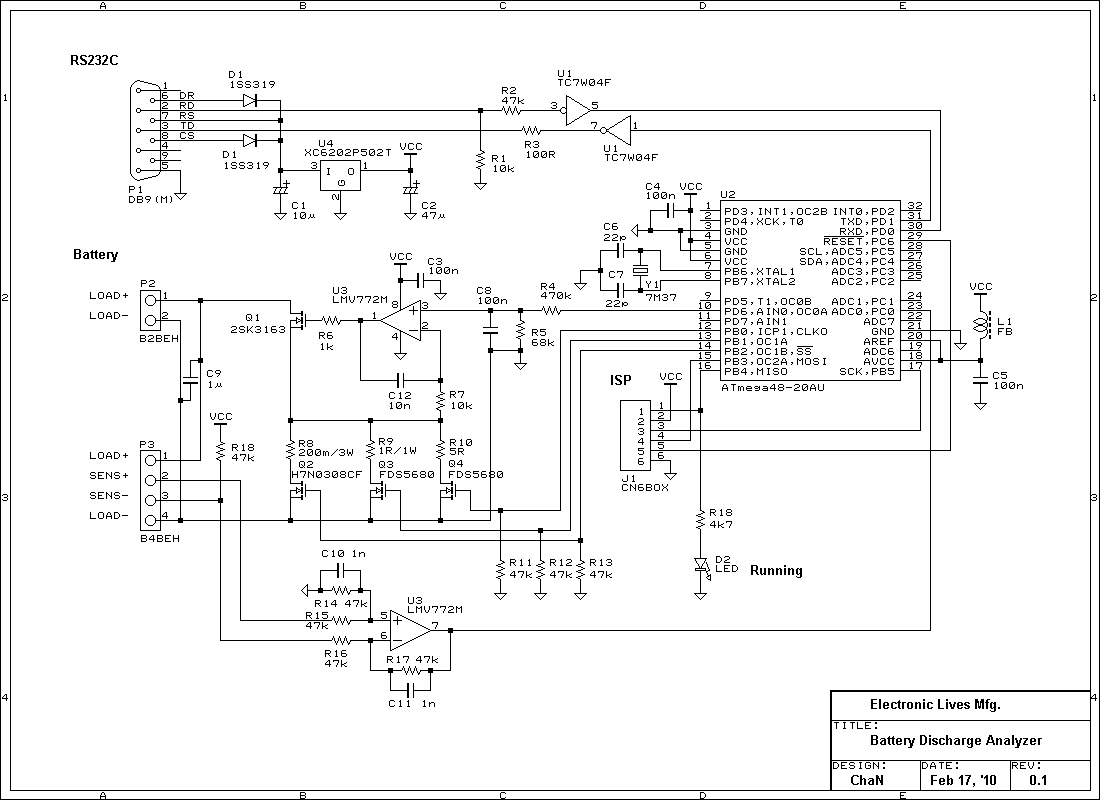 Right image shows the photo and circuit diagram of the built battery discharge analyzer. It is controlled with a PC via a serial port. No external power supply is required because it is powered by RS-232C signals.
