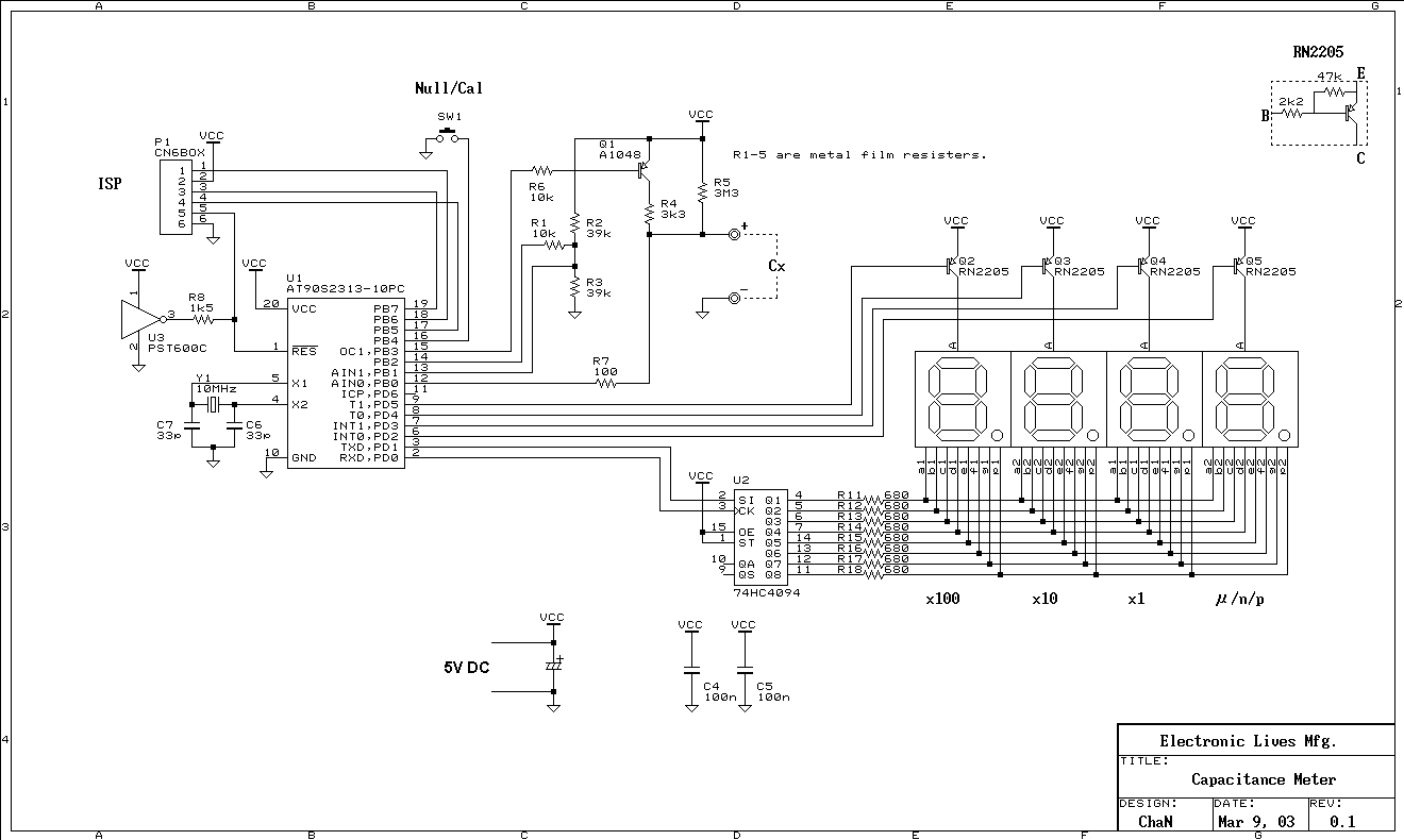 測定動作はまず、Lowレンジ(3.3MΩ)で充電を開始します。約130ms以内に0.5Vccに達しない(約57nF以上)場合は、一旦放電して Highレンジ(3.3kΩ)で再度開始します。約1秒以内に0.5Vccに達しない(約440μF以上)ときはエラー"E2"です。このように測定レンジは2レンジ自動切り替えです。有効な時間がとれたら、静電容量を算出して結果を表示します。10pF以上は上3桁が表示され、常に3桁の有効桁数となります。つまり、表示レンジは00.0p〜000μの8レンジ自動切り替えということになり、煩雑なレンジ切り替えの操作は不要です。
