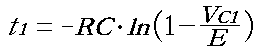 で表されます。それぞれの単位は、時間tが秒、抵抗RがΩ、静電容量CがF、電圧EがVで、εはネイピア数(約2.72)です。また、Cの端子電圧がある値VC1に達するときの時間t1は、