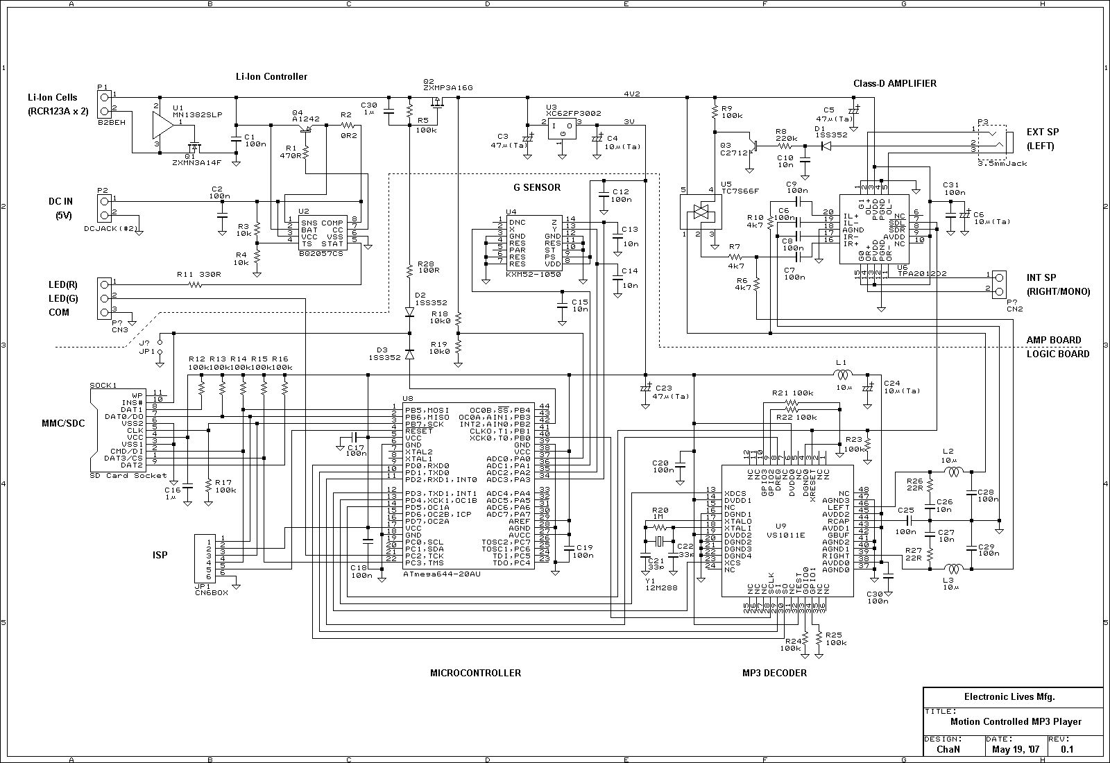 The main power is switched with a media detection contact of the memory card socket. When a memory card is inserted into the socket, the power is on and start to playback, and remove the card to stop. The voltage from cells (3.5-4.2V) directly is distributed to power amplifier and regulated voltage (3.0V) is for controller.