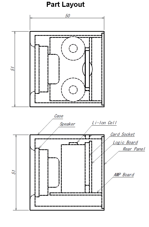 The inner dimensions of the case to build the MP3 player in is already determined because an existing case is used. The circuit boards and Li-Ion cells to be embedded are laid out and composed like shown in Photo 3. The effective inner dimensions becomes pretty tight due to a jut out of loudspeaker. Figure 3