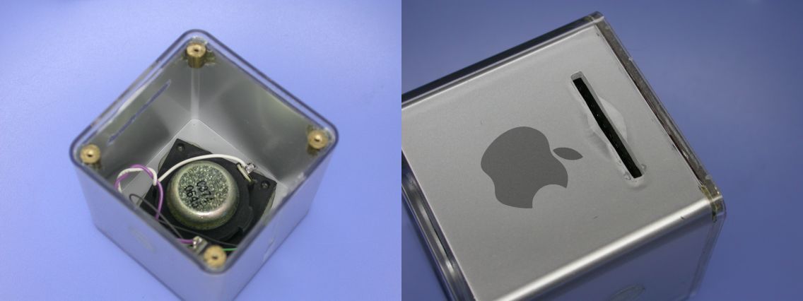 I chose a PC speaker MS-77 manufactured by Elecom for this project. It is separated in left and right channels and the amplifier was built into the right one. To built the MP3 player into the case, open the case and remove the amplifier. The rear panel was fixed in ultrasonic welding. I drilled some holes to the rear panel, and pulled and remove it. The internals are held by only rear panel and there was nothing to fix inside the case so that I bonded four studs to the corners to fix a rear panel (Photo 2a). A slot (2.5 x 25mm) is required on the case to insert a memory card. Because the material is acrylic resin, it should work with care of crack and chip (Photo 2b). The indicator lamp (two color chip LED) is embedded into a hole that drilled at bottom of the case.