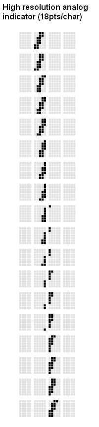 Analog pointers are displayed with user defined characters. The reason why is it drawn with slant edge is from the limitation of the character LCD. The width of character is 5 dots and a dot space is exist between the characters and therefore the variations on the blinded points cannot be recognized. The slant edge crosses over the blinded point and the variation can be recognized.