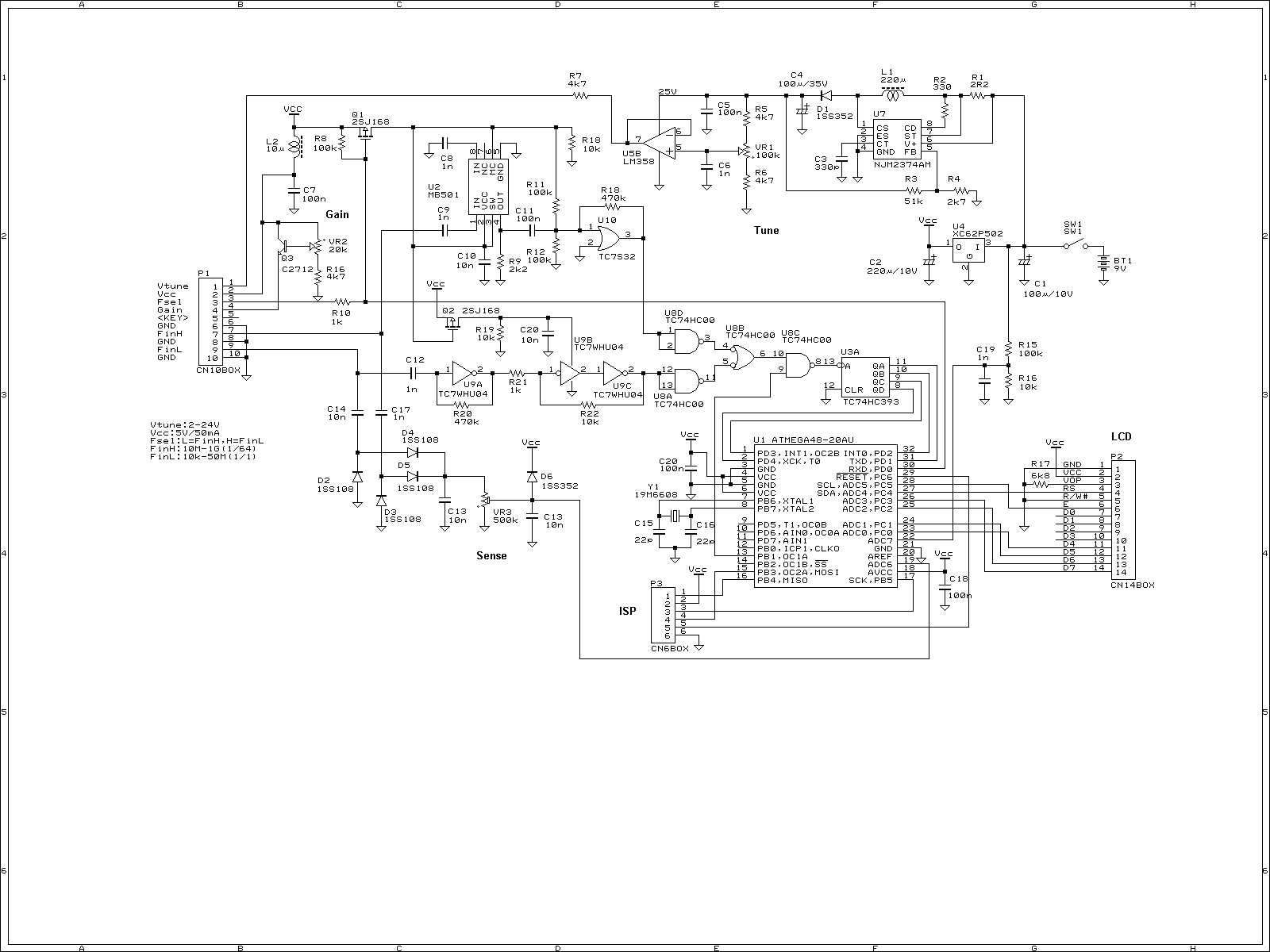 The oscillation frequency is measured by an AVR and displayed to the LCD. The allowable input frequency of the timer/counter unit of the AVR is fclk / 2.5 (20 / 2.5 = 8 MHz) maximum. To measure above this limit, an external prescaler circuit is needed. However input frequency range of the primary prescaler (MB501) is 10 MHz minimum (actuary it works at 1 MHz) and the freqency range between 8 to 10 MHz is out of working range. I added a secondary prescaler (74HC393) in front of the AVR to expand input frequency range to cover both frequency ranges. The 8-bit Timer 0 is used to measure the frequency but overflow is also counted to measure 28-bit resolution.