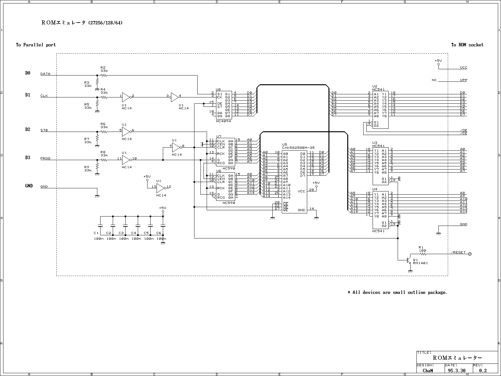 いままでは、ボードマイコンを組むとそれに組み込むプログラムをデバッグするのに EP-ROMまたは EEP-ROMに書いては試しの繰り返しで、なかなか骨の折れる作業でした。 そこで、簡単な ROMエミュレータを作ってみることにしました。ROMエミュレータなら、ターゲットシステムに接続したままプログラムを転送するだけで済みます。 ROMの抜き差しの手間が省けるので、デバッグ効率も大幅に向上するというわけです。
