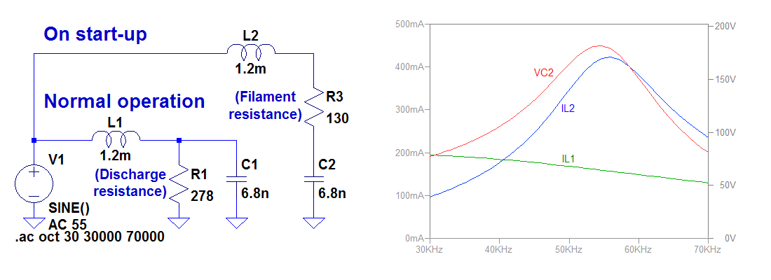 図3にHCFL駆動回路のシミュレーションを示します。図中には2回路描かれていますが、これはランプの状態により回路が変化するためで、上が放電開始前、下が放電中の回路となります。LCの共振周波数は55kHzに設定しています。放電開始前は周波数によって共振電流が大きく変化するのが分かるでしょう。放電中は周波数による電流の変動は緩やかに見えますが、実際にはランプインピーダンス(R1)は負性抵抗なのでもっと大きく依存します。