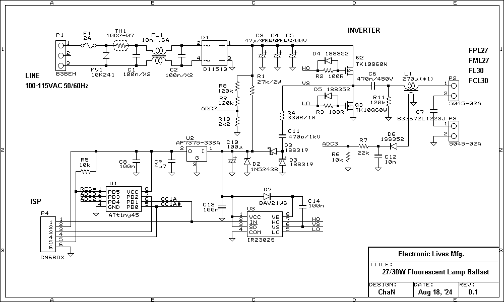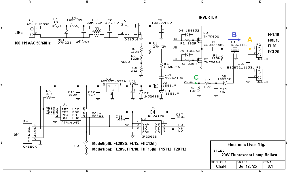 In fact, there are many single-chip fluorescent lamp controllers that can make up the electronic ballasts, so utilizing these ICs will be the best way for making the fluorescent lamp ballasts. However it is not interesting to make it as an experimental project. In this project, I built it in digital control with a microcontroller. Figure 7 shows the built fluorescent lamp ballast and the schematic. It is designed for common 18/20 W lamps. I built another one for 27/30 W but these are functionally identical, so that I omitted to describe it individually and put the design in the resources section.