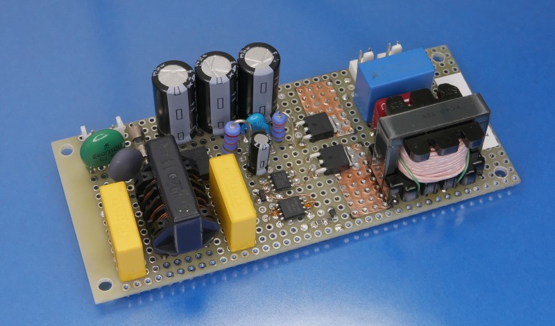 The U1 in the schematic is an 8-bit microcontroller, ATtiny45 from Microchip, that has a timer unit suitable to drive an inverter. The U3 is a gate driver that drives the half-bridge Q2 and Q3. The R4 and C14 on the output of inverter work both as snubber and auxiliary power supply for contrller part. The inductor L1 consist of PC40EI25-Z (gap=0.3 mm) as a core, 53 turns of litz wire (0.08 mm by 30 strands) as main winding and a turn of wrapping wire as auxiliary winding.