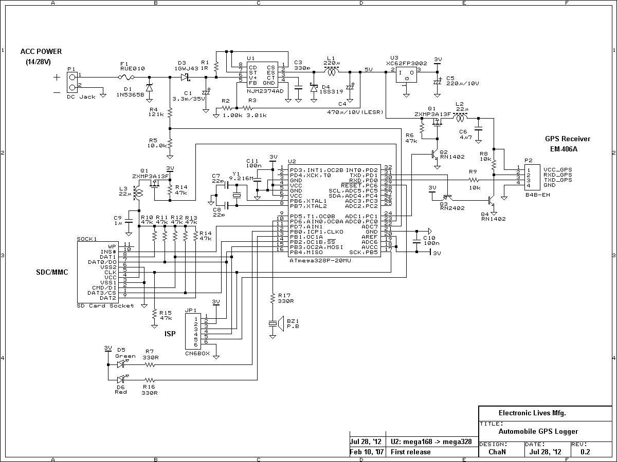 For easy installation, the GPS data logger is powered by only ACC line. No power switch is supported and start/stop the logging by ACC on/off. The energy for file close process after black out is held in C1. Of course it should be not only proof against painful input but also avoid incorrect operation due to unstable supply voltage. This requires also some considerations on software design.
