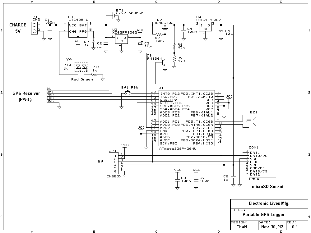A MicroSD card is used to record the navigation solution data with ATmega328P microcontroller. To use memory cards with a microcontroller, certain program space to implement a FAT file system is required. It depends on the microcontroller family and at least 16-32K bytes will be required for the AVRs. This controller does not have a mechanical power switch and the power is always supplied to the AVR. To reduce OFF state current, the power consumption of the regurator IC must be samll as possible. The Torex XC62FP3002 CMOS regurator used in this project is only 2μA in supply current. Right image shows the built circuit board and its circuit diagram.