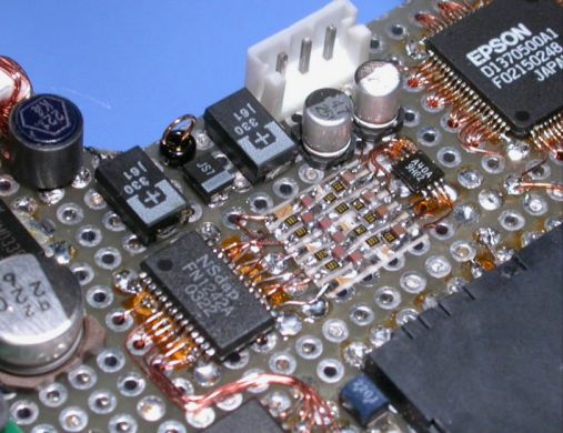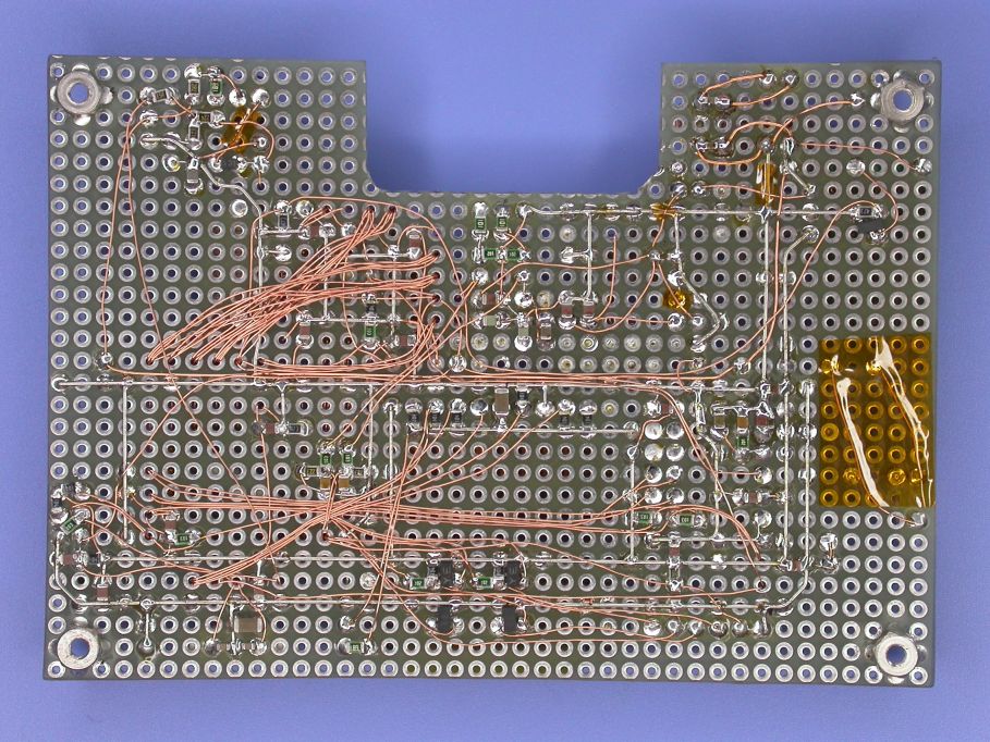 The circuit board must be embedded into a space in height of 10mm, so that the allowable height of the components on the circuit board is less than 6mm. Most of components used in this project ware surface mounted device. They are mounted on the proto-board directly and wired with UEW. This method requires soldering skill and practices but there is an advantage that it can achieve the density of double layered PCB or more. The FPC connector (0.5mm) easily creates solder bridge due to its terminal forms, so that solder the wire to the terminal via a stripe PCB instead of solder the wire directly.